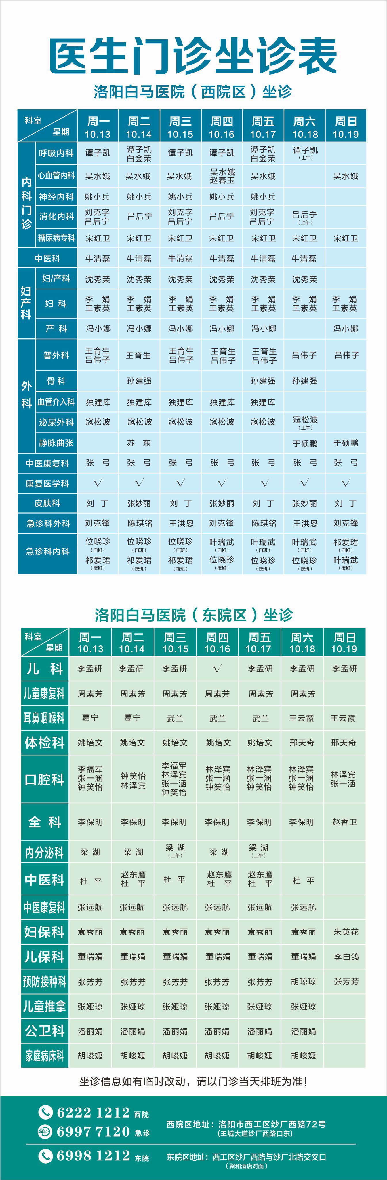 【10.13-10.19】洛阳白马医院医生门诊排班表