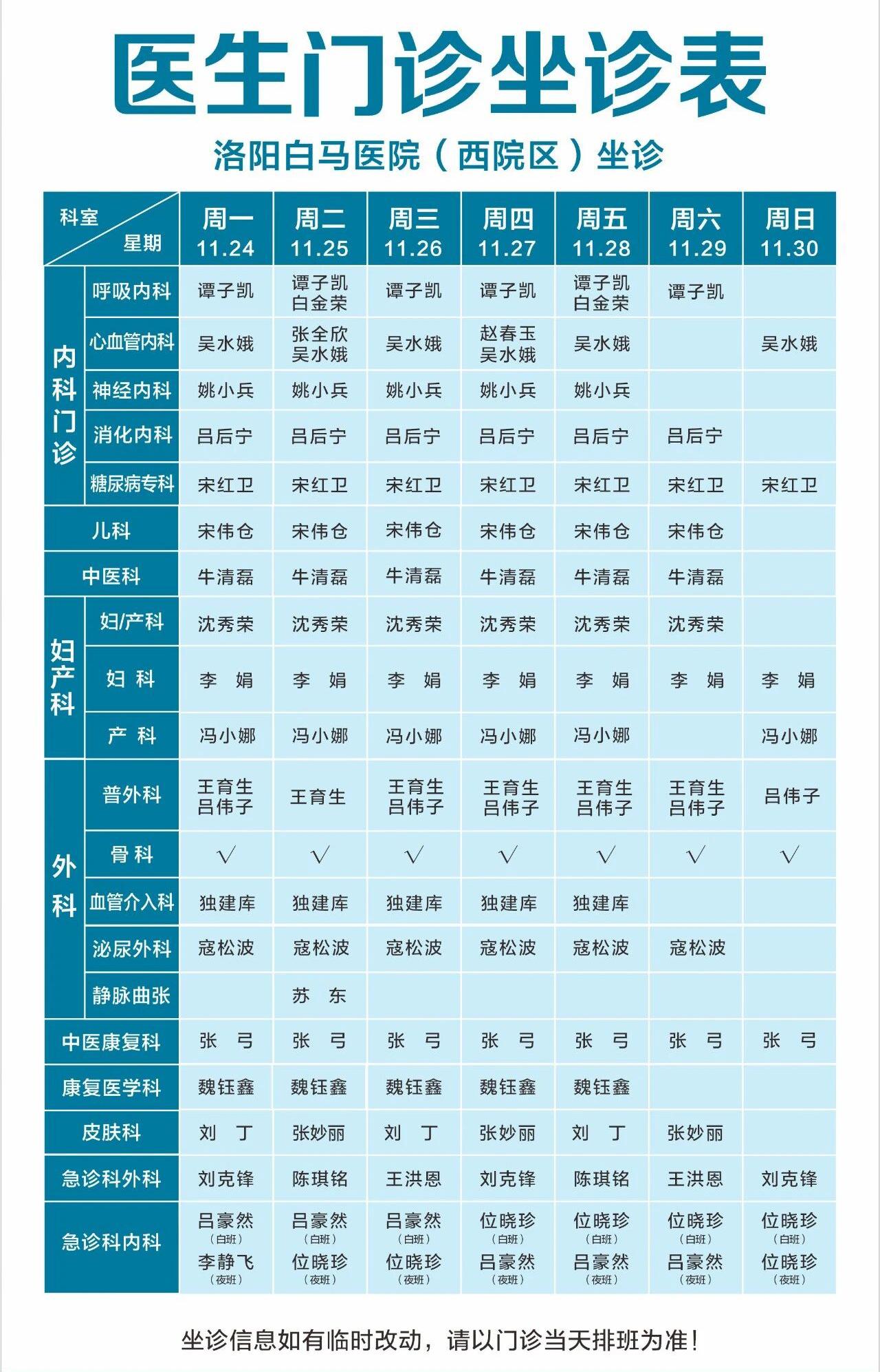 【11.24-11.30】洛阳白马医院医生门诊排班表