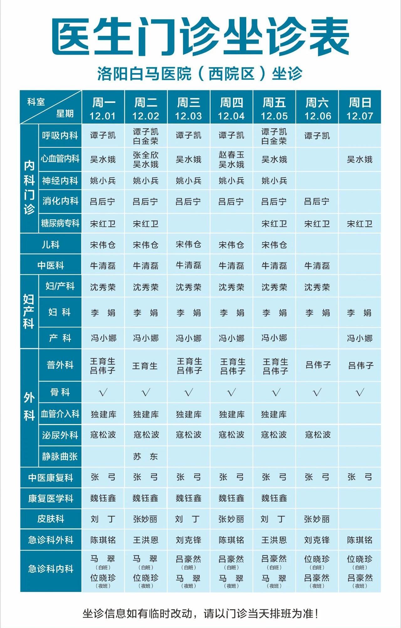 【12.01-12.07】洛阳白马医院医生门诊排班表