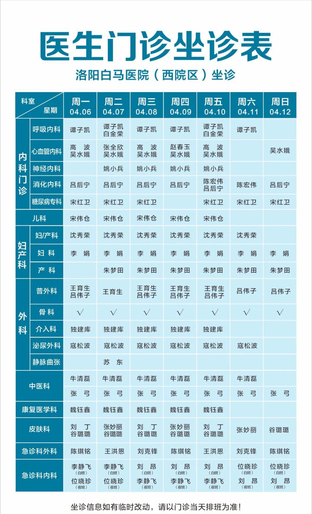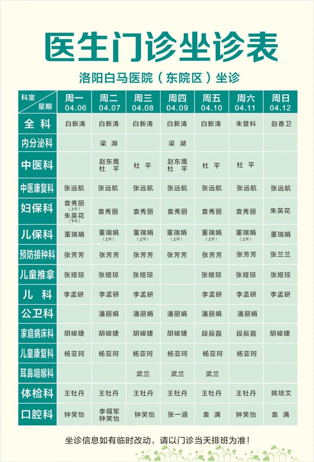 【4.6-4.12】洛阳白马医院医生门诊排班表